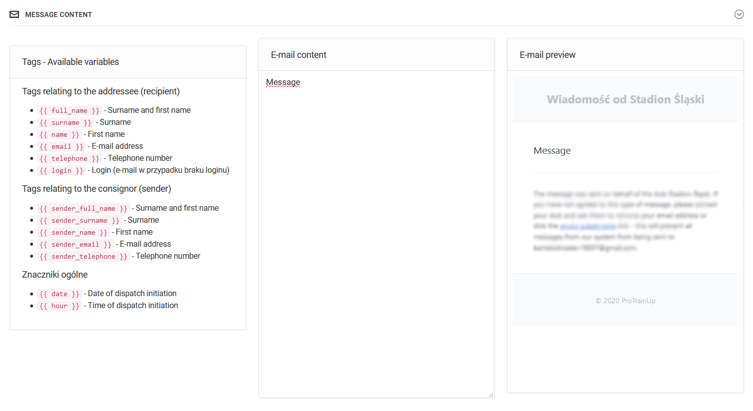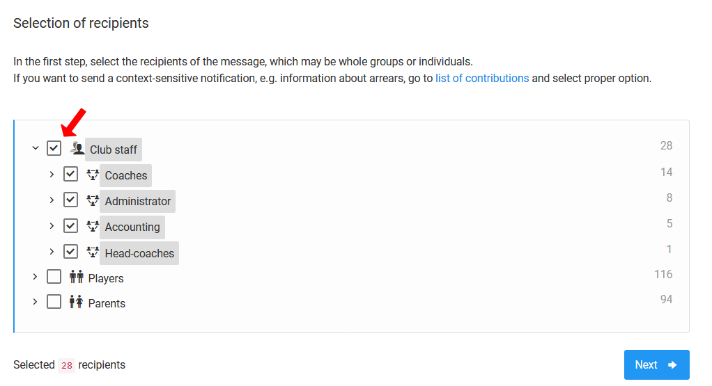 Jak vidíte, při vytváření kampaně od základu máte možnost ještě přesněji vybrat příjemce zprávy. Můžete připravit kampaně pouze pro zaměstnance klubu, rodiče, hráče nebo pro všechny najednou. Ve skutečnosti můžete připravit informační kampaň s cílením omezeným i na jednu osobu.