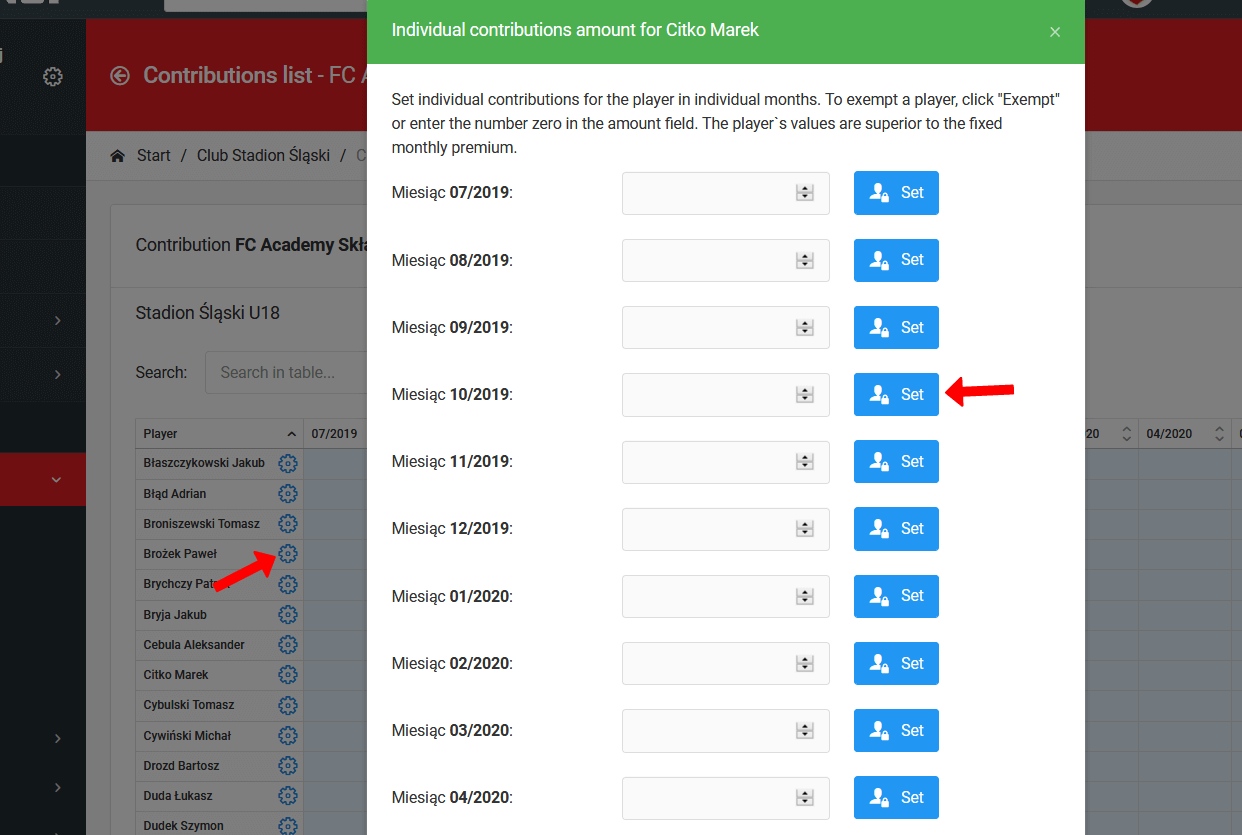 Das System ermöglicht es Ihnen, individuelle Beitragsbeträge für jeden Spieler in Ihrem Verein festzulegen. Gehen Sie dazu im linken Menü zu Verein Beitragsliste und klicken Sie auf den Beitrag, der Sie interessiert. Nach dem Klick auf den Namen des Beitrags gelangen Sie zur Beitragstabellenansicht, wo Sie in der ersten Spalte die Liste der Spieler sehen. Neben dem Namen jedes Spielers befindet sich ein blaues Symbol. Wenn Sie auf das Symbol klicken, erscheint ein Fenster zur Individualisierung des Beitrags.