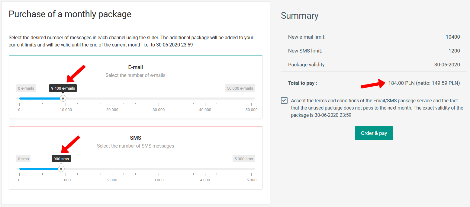 Um ein zusätzliches Nachrichtenpaket zu erwerben, verschieben Sie bitte die Schieberegler und wählen Sie aus, wie viele SMS oder E-Mails Sie kaufen möchten. Der Preis der Pakete hängt von dem Land ab, in dem Ihr Verein tätig ist. Nach der Auswahl der Pakete sollten Sie die Bestimmungen akzeptieren und auf "Bestellen und bezahlen" klicken. Sie können über DotPay bezahlen. Ihr Paket wird sofort nach Buchung der Zahlung aktiviert.