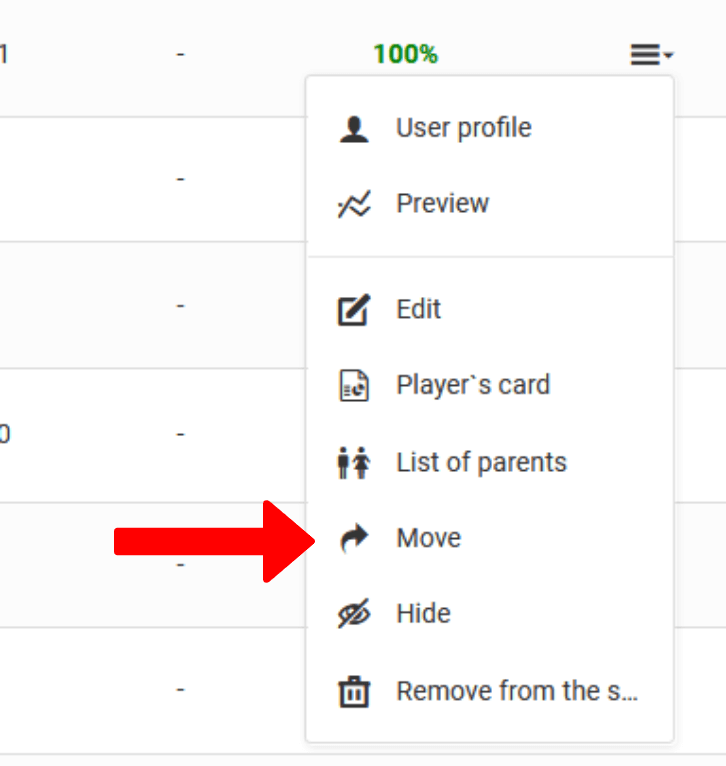 Das System bietet die Möglichkeit, Spieler zwischen Teams innerhalb einer Einheit zu kopieren/transferieren. Sie haben zwei Möglichkeiten, einen Spieler zu kopieren oder zu transferieren. Dazu müssen Sie die Option "Verschieben" aus dem Spielermenü auswählen.