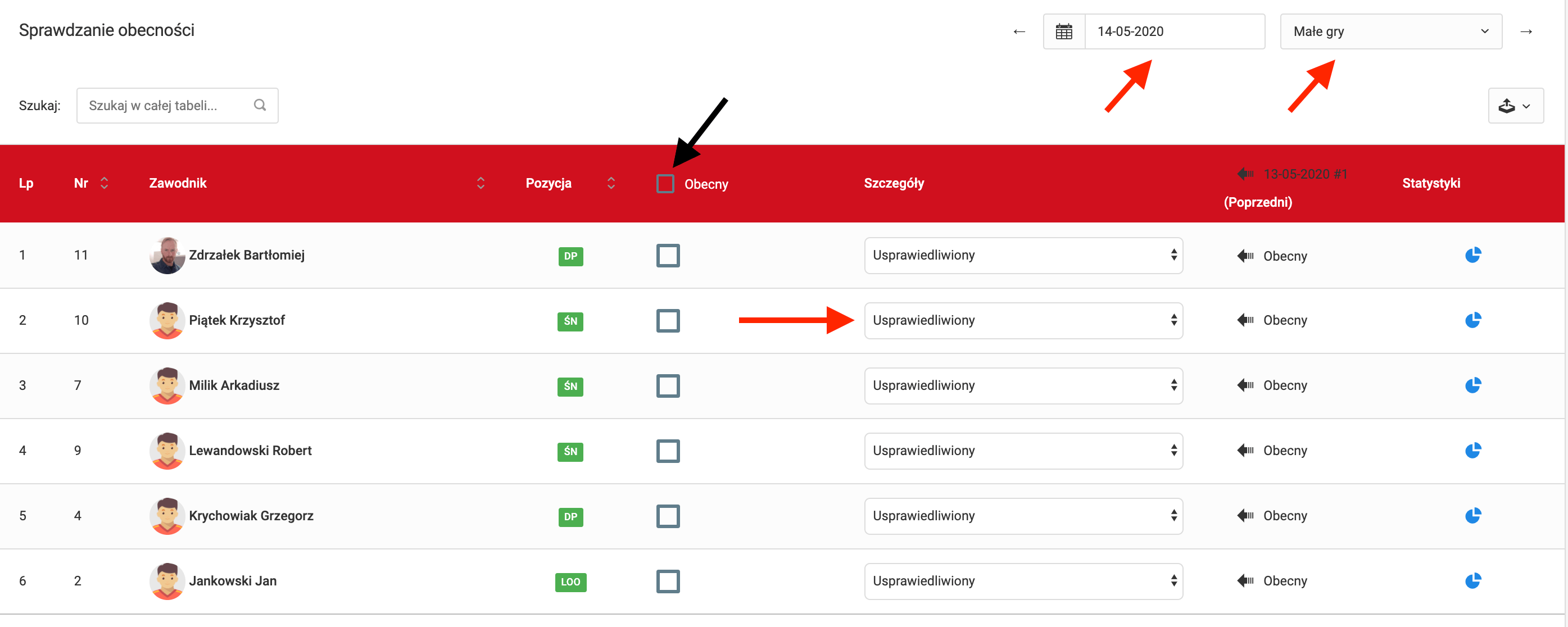 W oknie sprawdzania obecności znajduje się kilka istotnych elementów. Idąc od góry: dwa pola wyboru w prawym górnym rogu. Tam wybierasz datę oraz konkretny trening danego dnia. Pamiętaj, że aby sprawdzić obecność musisz wcześniej utworzyć trening. Możesz utworzyć więcej niż jeden trening dziennie. Trening może zostać zaplanowany także poprzez aplikację mobilną. Kolejnymi istotnymi elementami są checkbox'y których zaznaczenie oznacza obecność zawodnika na treningu. W kolumnie ze szczegółami możesz wybrać z listy rozwijanej powód nieobecności zawodnika na treningu.