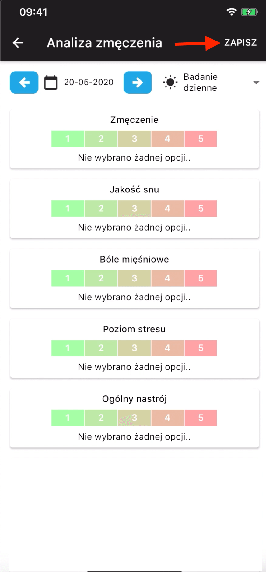 Po kliknięciu w powiadomienie lub po kliknięciu w lewym menu dziennik analiza zmęczenia arkusz wyników, zawodnik zostanie przeniesiony do widoku ankiety. Tam w zależności od wybranego typu pomiaru pojawi się odpowiednia liczba pytań. Pamiętaj, żeby zawodnik otrzymał powiadomienie push oraz możliwość uzupełnienia odpowiedniej ankiety w przypadku badania potreningowego i pomeczowego, jest kilka warunków do spełnienia,