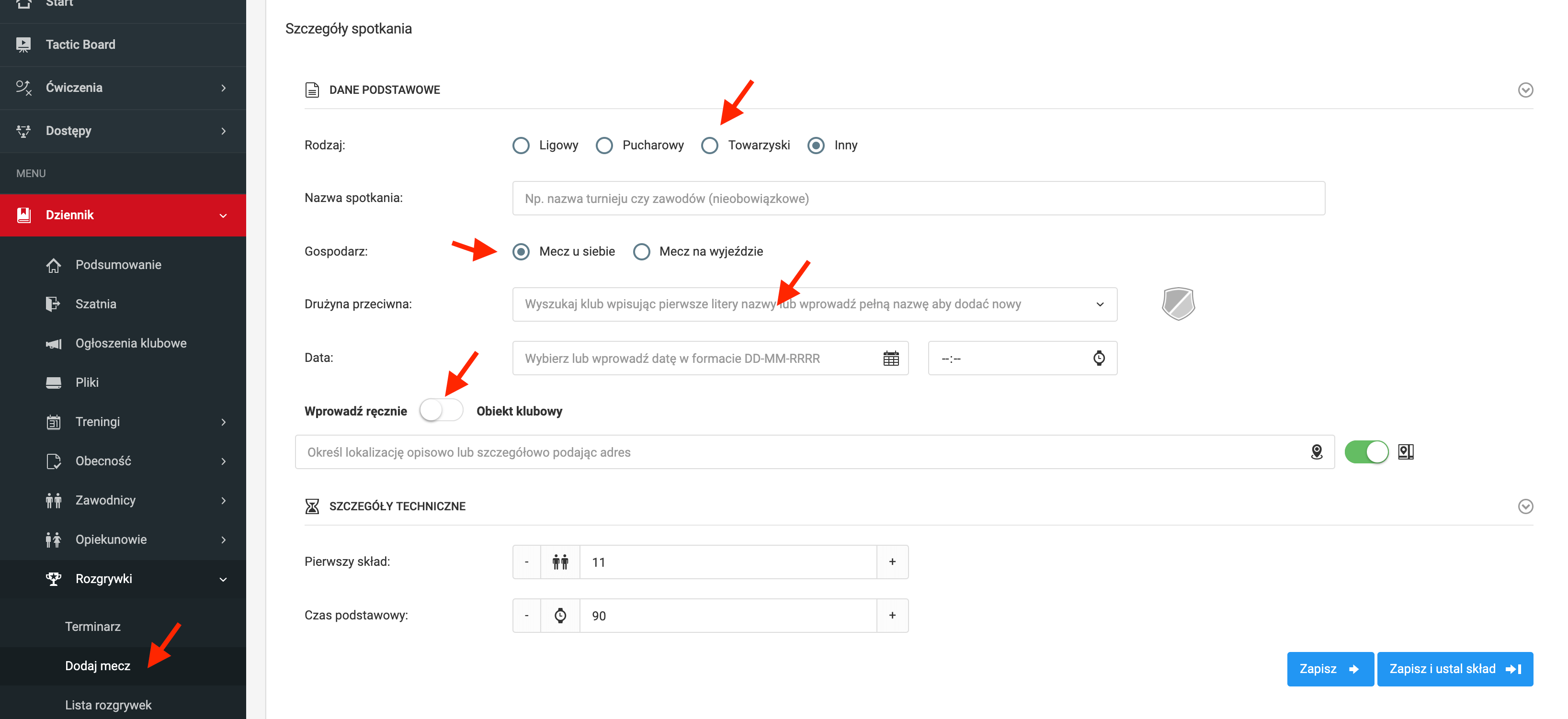 Aby dodać pojedynczy mecz do Twojego terminarza, kliknij w lewym menu dziennik rozgrywki dodaj mecz Po kliknięciu tej opcji zostaniesz przeniesiony do okna tworzenia meczu. Uzupełnij kilka pól, które pojawią się w formularzu. Pamiętaj o określeniu typu spotkania, przeciwnika, daty, godziny oraz jego miejsca. Jeżeli chodzi o lokalizację możesz wpisać ją ręcznie lub wykorzystać predefiniowane obiekty, wprowadzane z poziomu konta administratora. Po uzupełnieniu wszystkich pól, zapisz formularz i przejdź do uzupełniania składu meczowego.