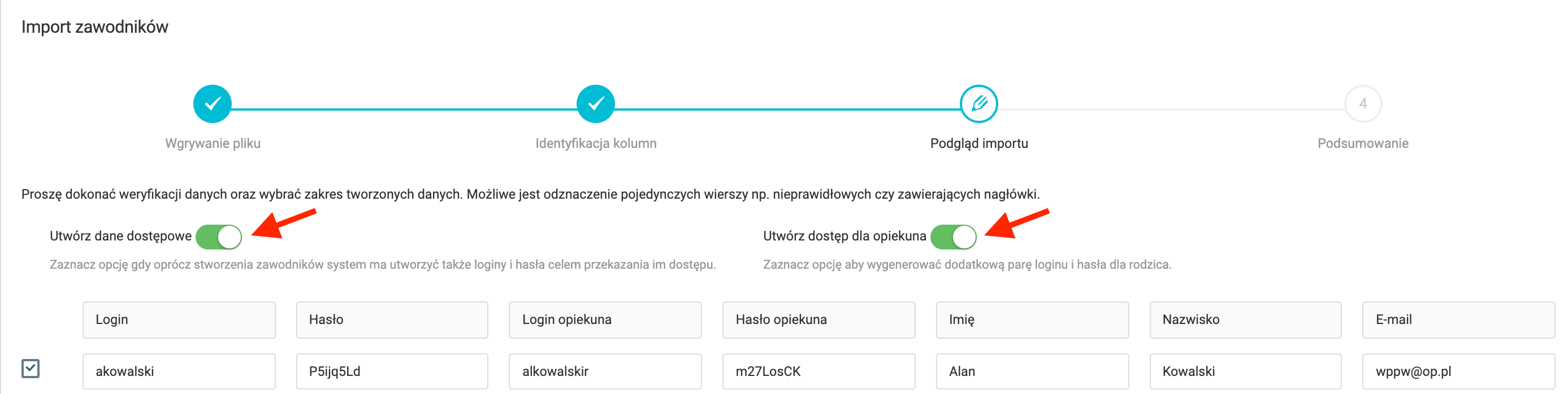 Aby masowo dodać zawodników i konta opiekunów za jednym razem, wybierz opcję importu danych z pliku. Aby wejść do importera, wybierz z lewego menu opcję dziennik zawodnicy import. W tym oknie możesz wgrać plik Excel z listą zawodników. Na podstawie tej listy zostaną wygenerowane loginy i hasła dla zawodników i rodziców.