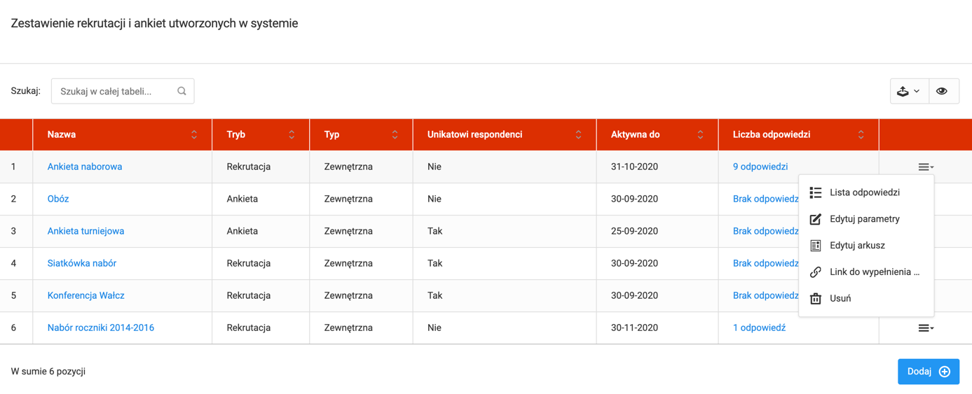 Na liście arkuszy znajdziesz wszystkie stworzone przez Ciebie arkusze. W tabeli poza nazwą arkusza znajdują się także informacje m.in.: o trybie, typie, okresie ważności ankiety oraz o ilości odpowiedzi. Ponad to w ostatniej kolumnie znajduje się kilka opcji. Znajdziesz tam listę odpowiedzi, edycję arkusza, edycję parametrów, link do formularza oraz opcję usunięcia arkusza.