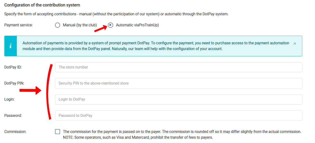 Щоб перейти до конфігурації системи внесків, виберіть вкладки налаштування в меню ліворуч . Як ви можете бачити на графіці, ви повинні заповнити дані свого облікового запису DotPay. Інструкції щодо налаштування та активації вашого облікового запису DotPay див. У нашому посібнику з інтеграції DotPay у нашу систему. [посилання]