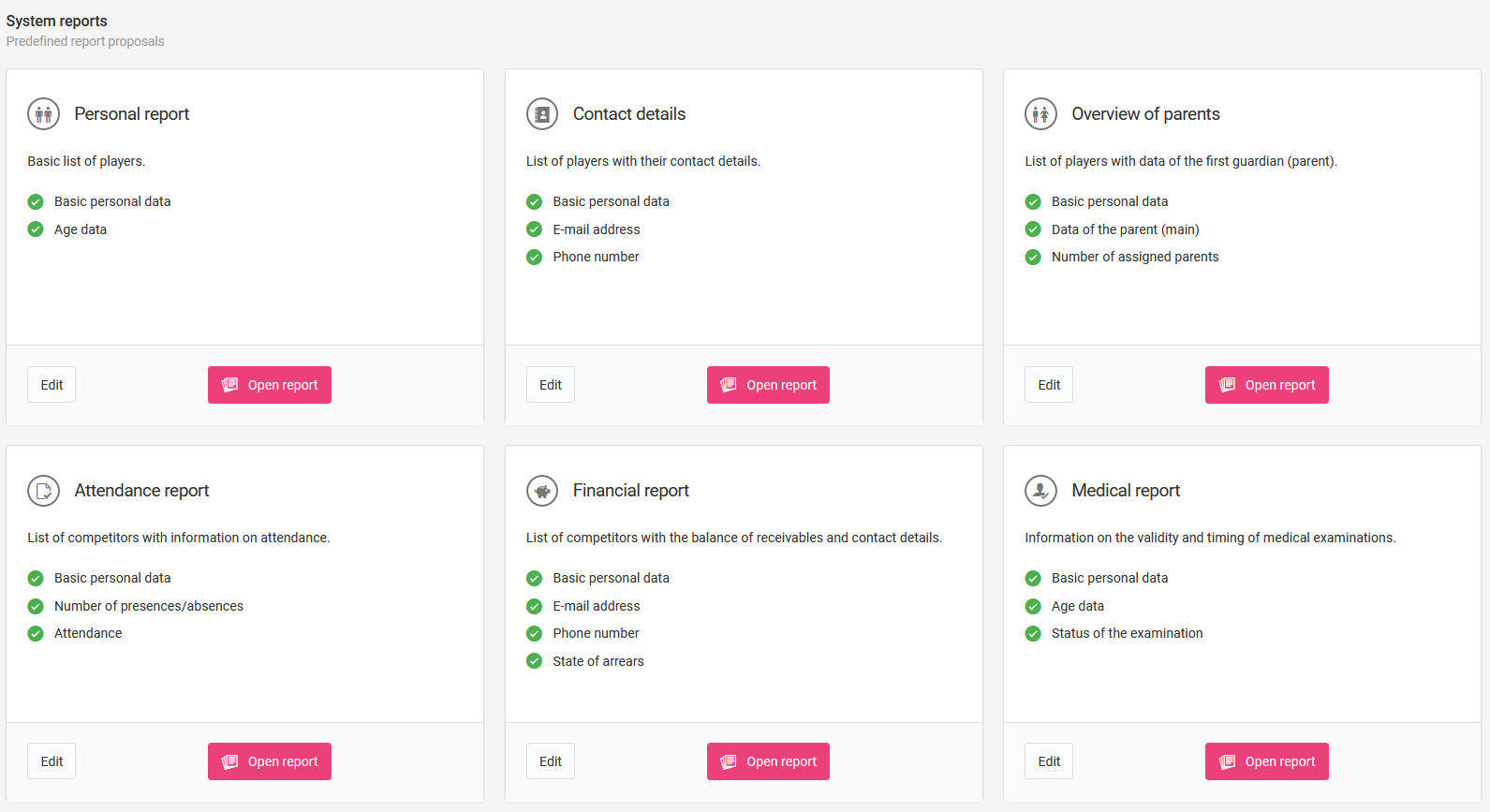 Детальні звіти можуть містити практично всі можливі дані, які наразі є в системі. Як користувач ви маєте доступ до кількох заздалегідь визначених звітів, тобто особистих звітів, контактних даних, списку осіб, які здійснюють догляд, звіту про відвідуваність, фінансового звіту, медичного звіту Щоб відкрити звіт, натисніть рожеву кнопку «відкрити звіт».