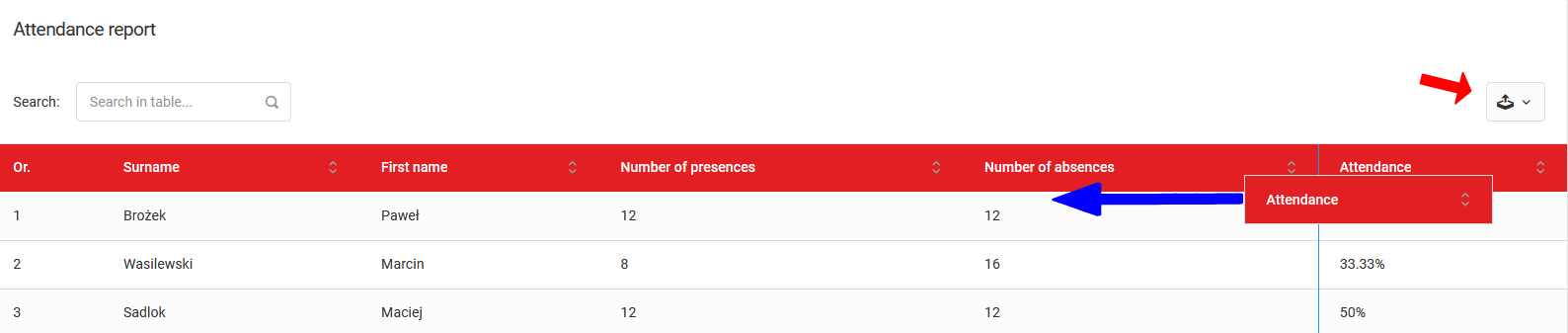 Після відкриття звіту ви перейдете до активної таблиці, де будуть зведені дані з області, визначеної у вибраному звіті. Таблиця дозволяє змінювати порядок стовпців, перетягуючи їх за допомогою миші. Ви можете завантажити кожен звіт у форматі: xls, csv або pdf, натиснувши піктограму над таблицею.